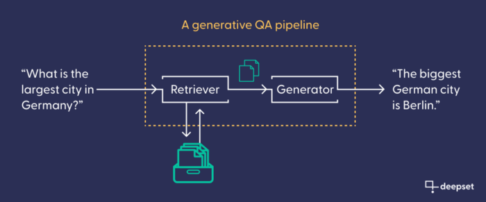 For each of those search paradigms, Haystack offers ready-made pipelines: search engine configurations with placeholders for language models for maximum efficiency. In this tutorial, we use the GenerativeQAPipeline. It consists of a retriever (to find relevant documents) and a generator (to write text), chained together. The retriever connects to the database. Like the generator, it is often (but not necessarily) based on a Transformer model. Its task is to retrieve the documents from the database that are most likely to contain valuable information, based on a user’s input query. Our generative model then uses those documents as a factual basis to write its answer.